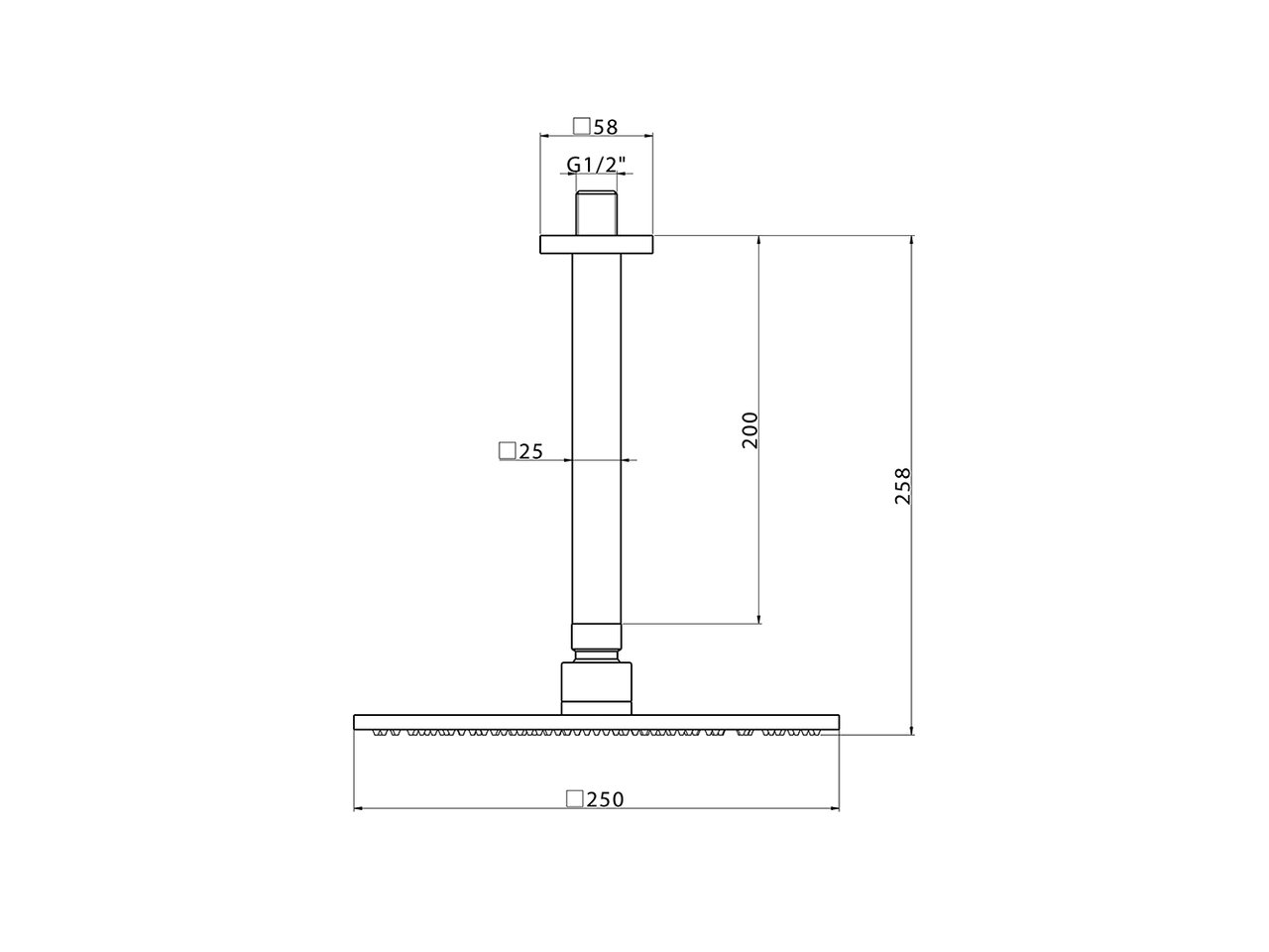 Braccio doccia a soffitto con soffione,soffione quadro 250x250 mm sp.8 mm in OTTONE,braccio doccia L.200 mm