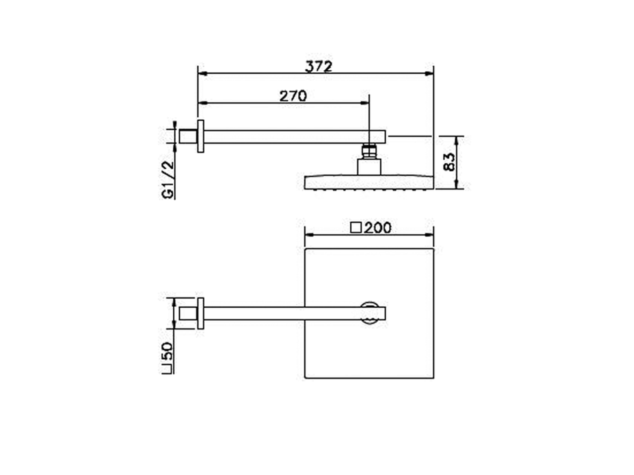 Braccio doccia con soffione,soffione quadro 200x200 mm in ABS,braccio doccia L.270 mm
