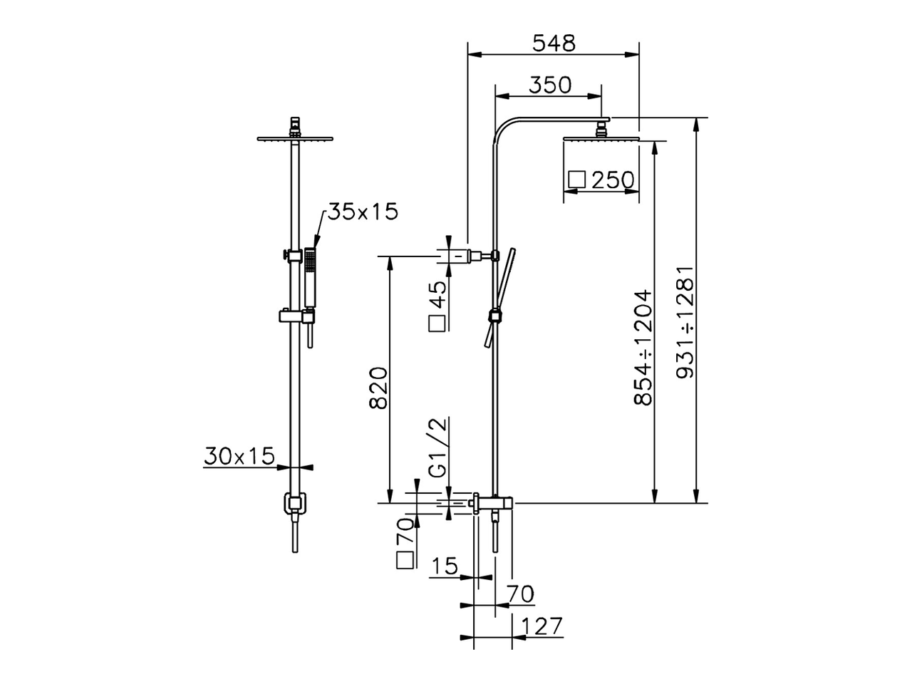Colonna doccia con deviatore,deviatore 2 uscite con presa acqua incasso,colonna telescopica,supporto doccetta scorrevole,doccetta monogetto minimalista 35x15 mm Ottone,soffione quadro 250x250 mm sp.8 mm in OTTONE,flessibile liscio SILVERFLEX 150 cm