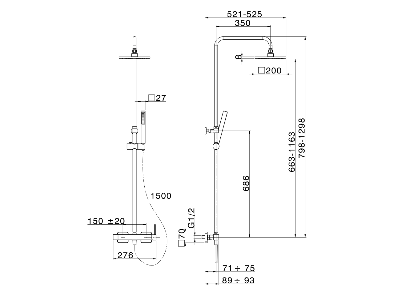Colonna doccia monocomando 2 funzioni,deviatore 2 uscite,colonna telescopica,supporto doccetta scorrevole,doccetta monogetto minimalista quadra 27x27 mm ABS,soffione quadro 200x200 mm sp.8 mm in Ottone,flex Ottone 150 cm