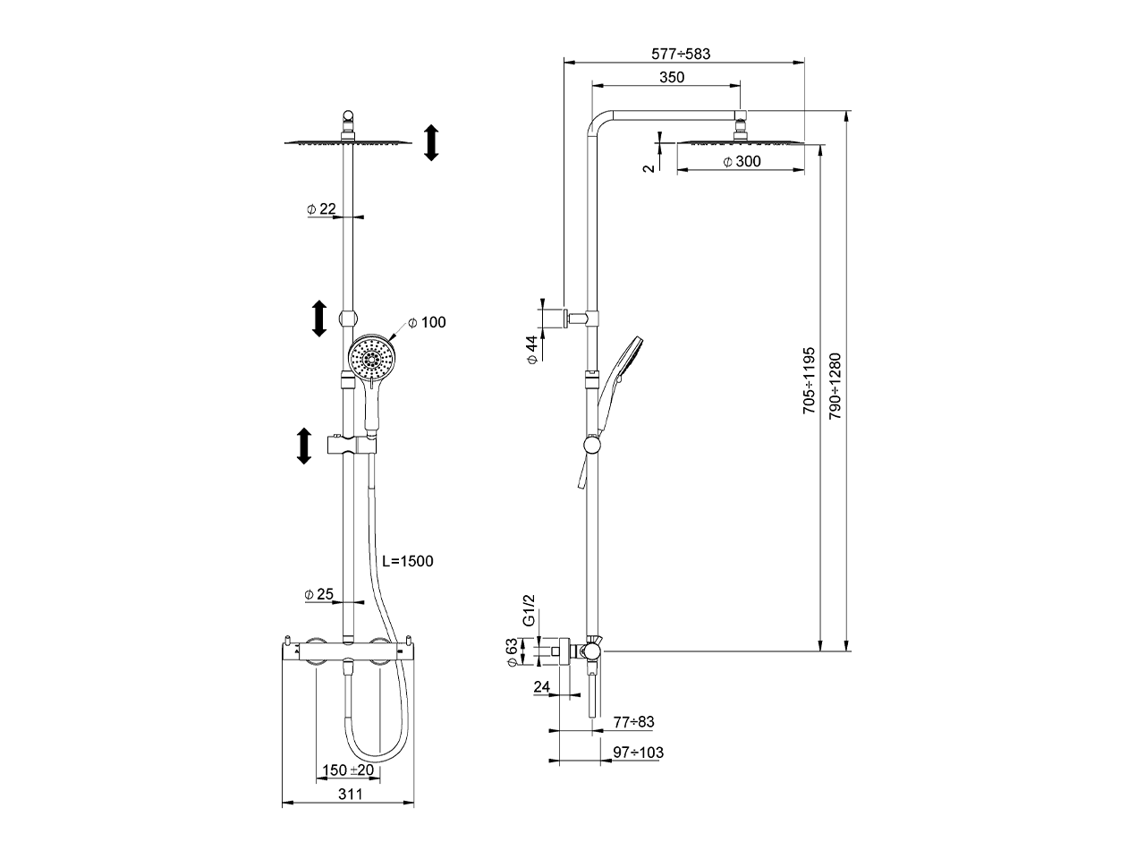 Colonna doccia termostatica 2 funzioni,deviastop 2 uscite,colonna telescopica,supporto doccetta scorrevole,doccetta 3 getti D.100 mm ABS,soffione tondo D.300 mm sp.2 mm in INOX,flessibile liscio SILVERFLEX 150 cm