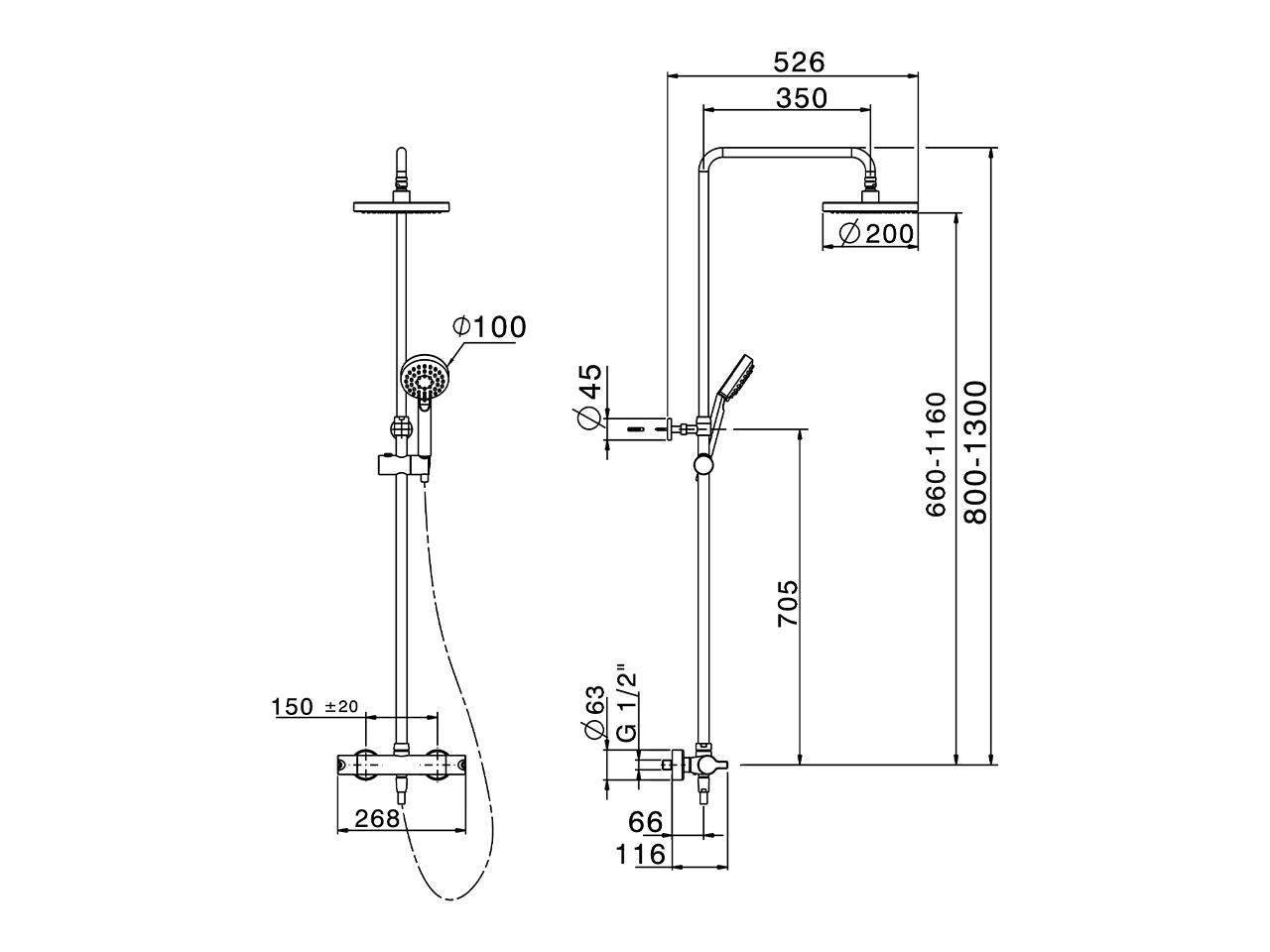 Colonna doccia termostatica 2 funzioni,deviastop 2 uscite,colonna telescopica,supporto doccetta scorrevole,doccetta 5 getti D.100 mm ABS,soffione tondo D.200 mm in ABS,flex ottone 150 cm