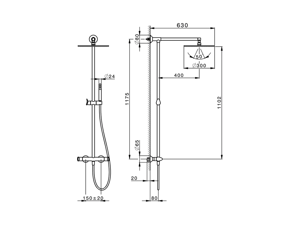 Colonna doccia termostatica 2 funzioni,deviastop 2 uscite,colonna fissa,supporto doccetta scorrevole in Ottone,doccetta monogetto minimale D.24mm in Ottone,soffione tondo D.300 mm in Ottone,flex liscio SUPREME 150 cm