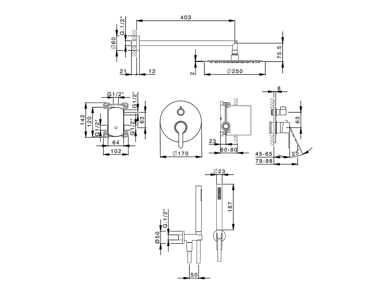 incasso,deviatore rotativo 2 uscite,supporto doccetta snodato murale,braccio doccia L.400 mm,soffione tondo D.250 mm sp.2 mm in INOX,doccetta monogetto minimalista in ABS D.26 mm,presa d'acqua 1/2",flessibile liscio SILVERFLEX 150 cm