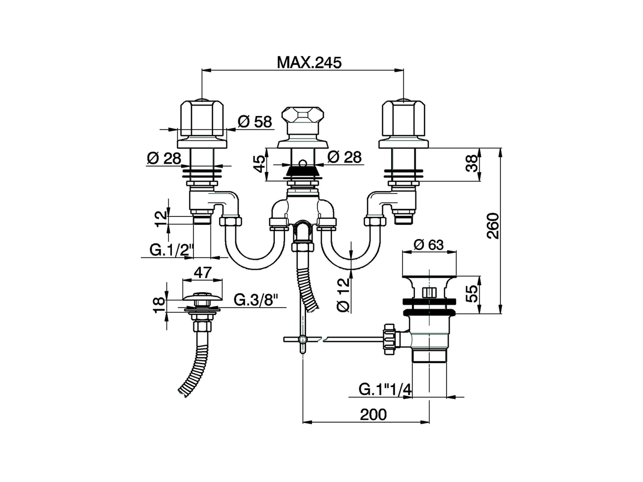Miscelatore bidet 3 fori con doccetta,con scarico automatico 1"1/4,senza maniglie