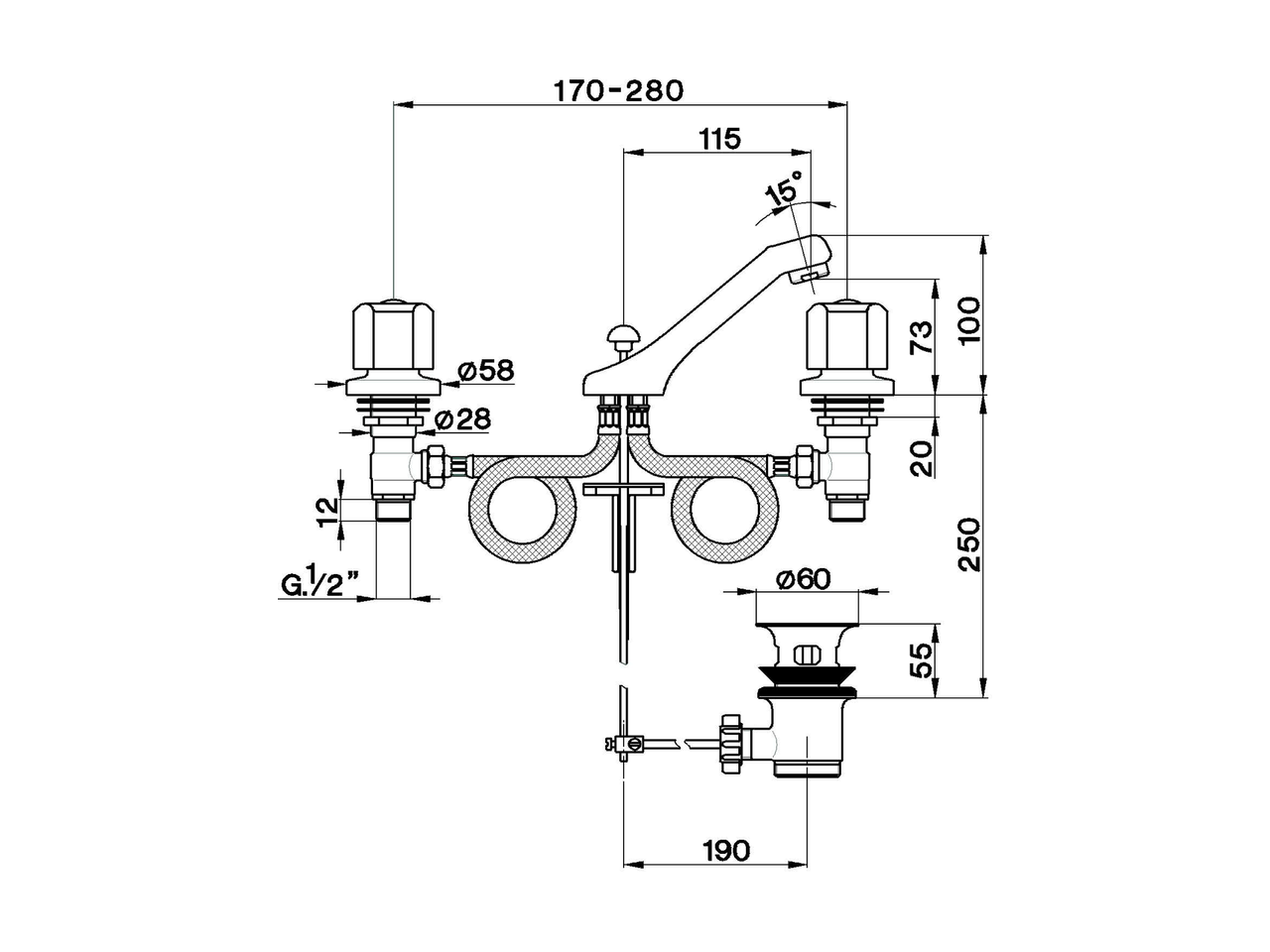 Miscelatore lavabo 3 fori,con scarico automatico 1"1/4,senza maniglie