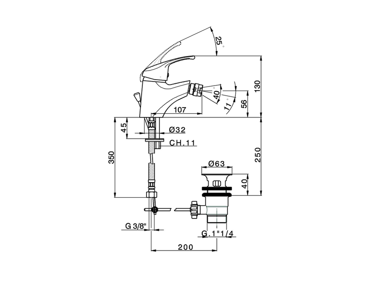 Miscelatore monocomando bidet,con scarico automatico 1"1/4,flex inox G.3/8"