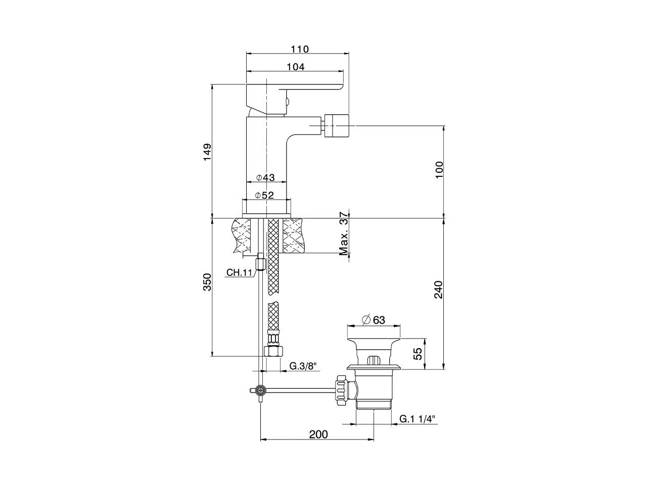 Miscelatore monocomando bidet,con scarico automatico 1"1/4,flex inox G.3/8"
