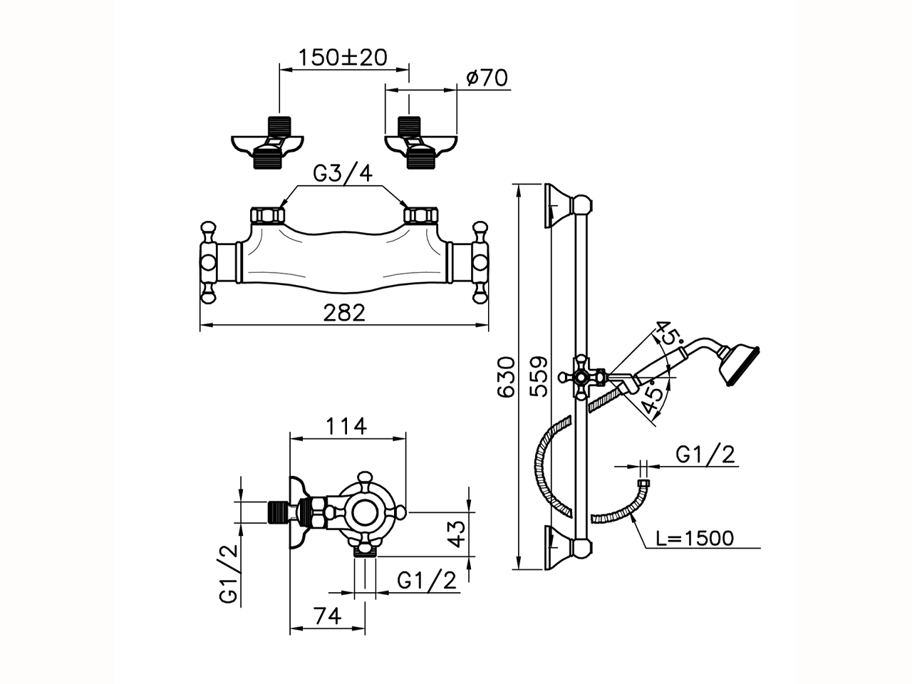 Miscelatore termostatico doccia con saliscendi,saliscendi con supporto scorrevole 56 cm,doccetta monogetto Classica in Ottone D.78 mm,flex Ottone 150 cm