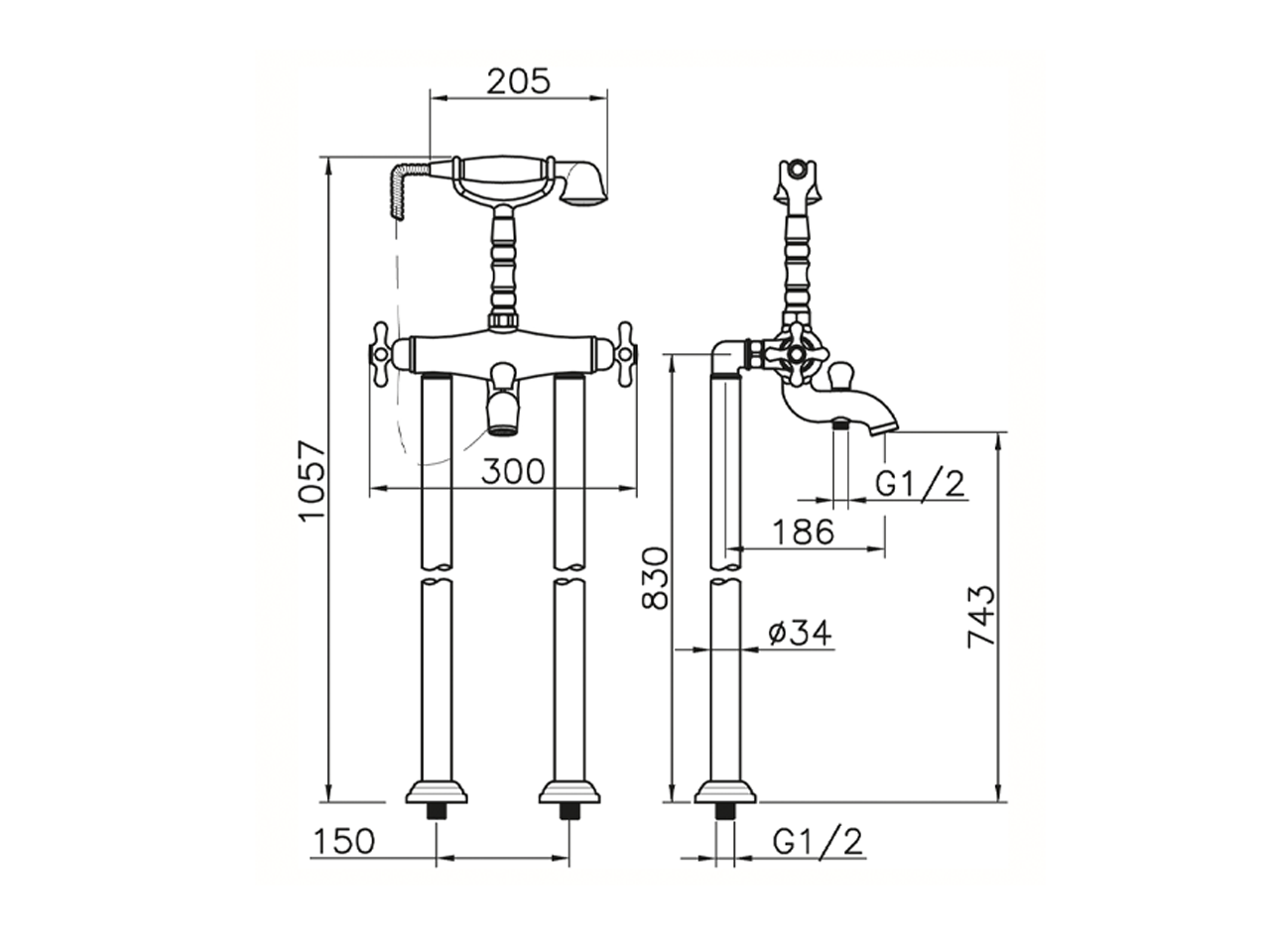 Miscelatore termostatico vasca a pavimento,supporto doccetta su forcella,doccetta monogetto Classica in Ottone D.53 mm,flex Ottone 150 cm