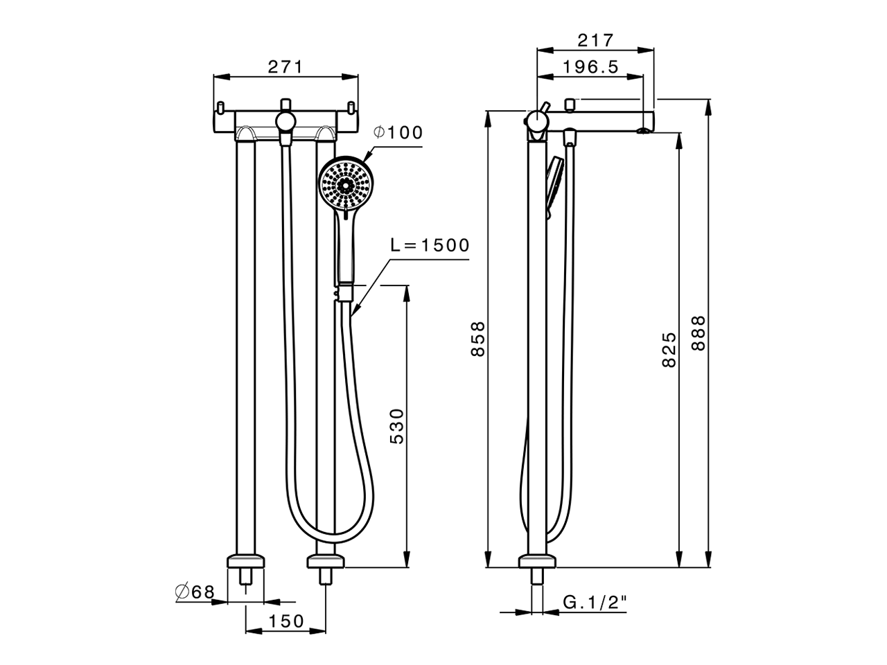 Completo termostatico Vasca Free Standing,supporto doccetta su colonna,doccetta 3 getti D.100 mm ABS,flessibile liscio SILVERFLEX 150 cm