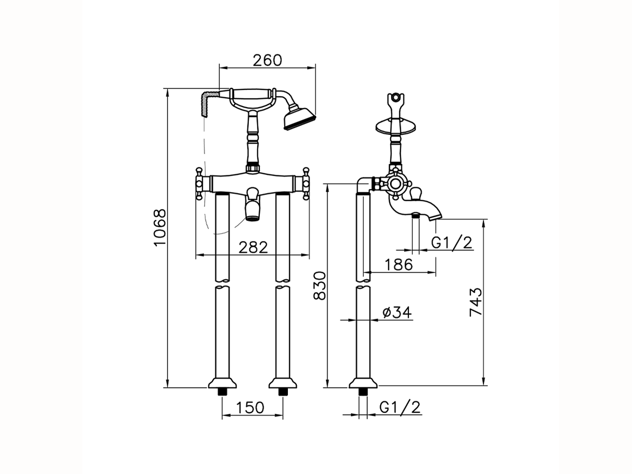 Miscelatore termostatico vasca a pavimento,supporto doccetta su forcella,doccetta monogetto Classica in Ottone D.78 mm,flex Ottone 150 cm