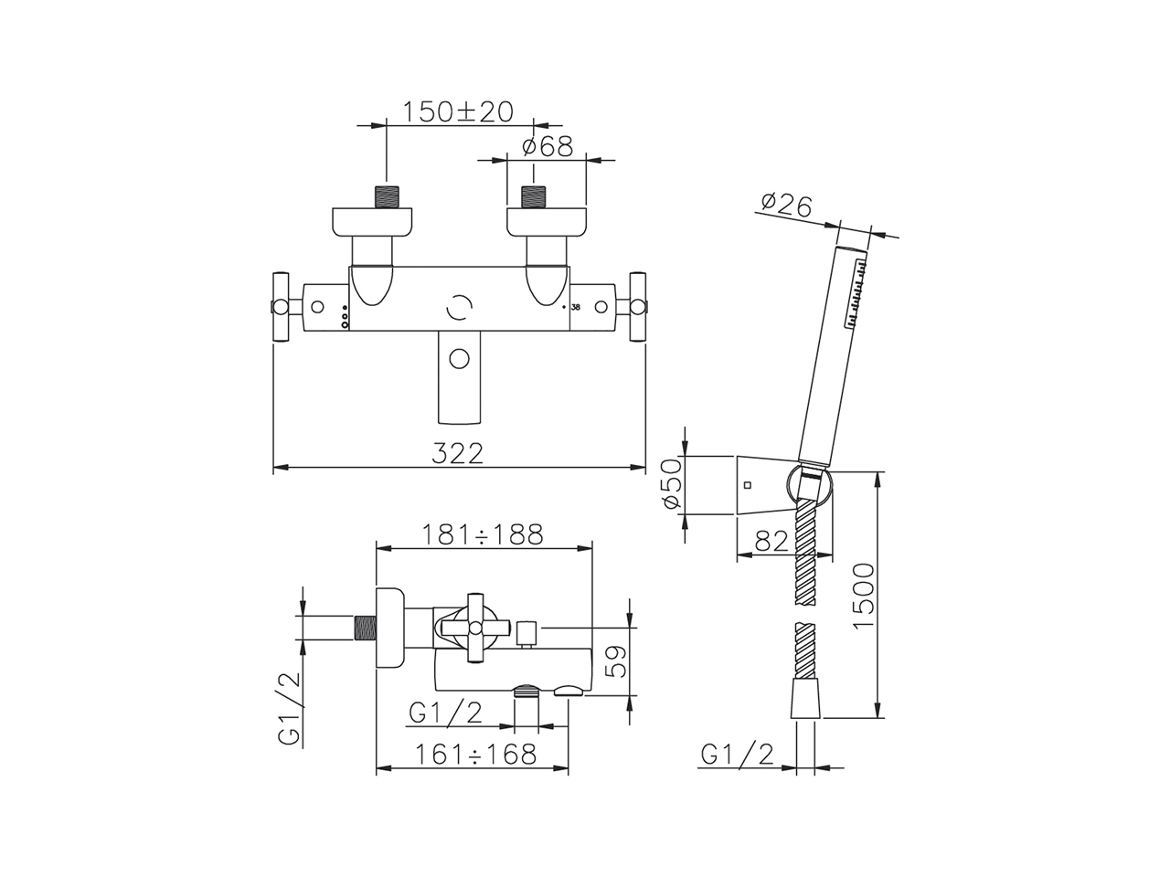Miscelatore termostatico vasca completo,supporto doccetta snodato murale,doccetta monogetto minimalista D.27 mm ABS,flex Ottone 150 cm