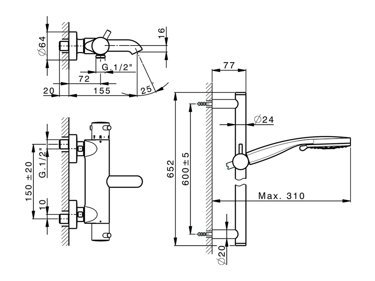 Miscelatore termostatico vasca con saliscendi,asta saliscendi 60 cm con supporto scorrevole,doccetta 3 getti D.100 mm ABS,flessibile liscio SUPREME 150 cm