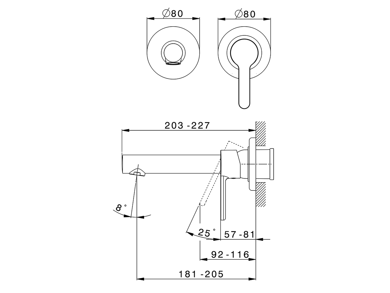 Parte esterna monocomando lavabo a parete,senza parte incasso,bocca L.200 mm,per art.