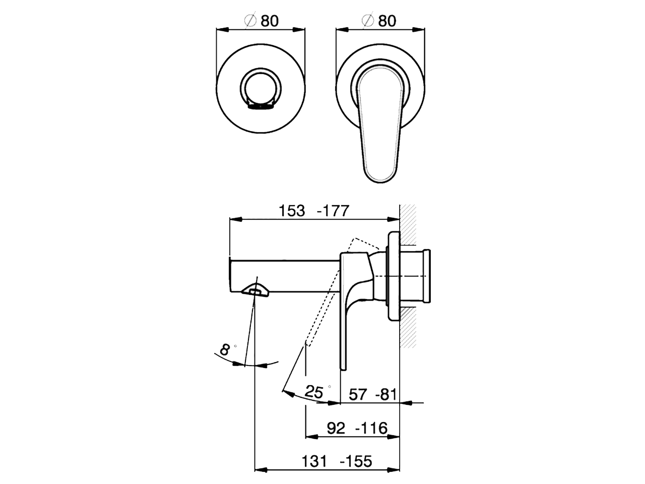 Parte esterna monocomando lavabo a parete,senza parte incasso,bocca L.150 mm,per art.