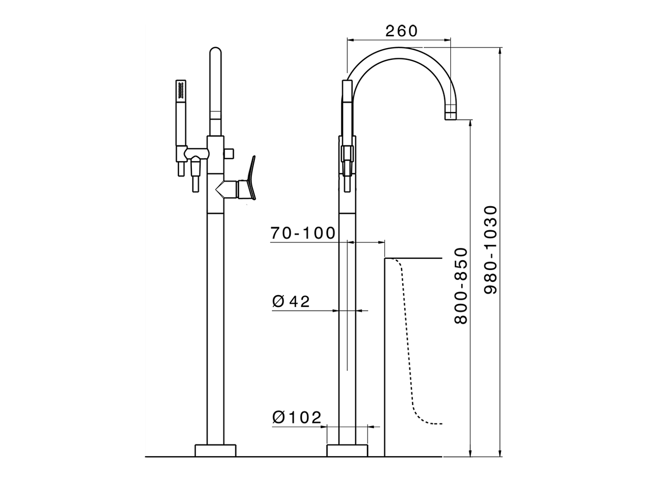 Parte esterna monocomando vasca a pavimento,supporto doccetta su colonna,doccetta monogetto minimale D.24mm in Ottone,flessibile liscio SUPREME 150 cm,senza parte incasso (per art.