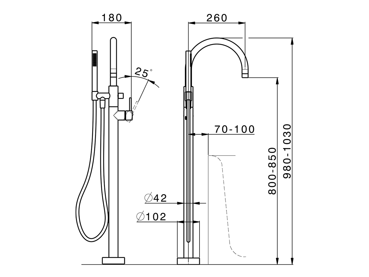 Parte esterna monocomando vasca a pavimento,supporto doccetta su colonna,doccetta monogetto D.23 mm in Ottone,flessibile liscio SUPREME 150 cm,senza parte incasso (per art.