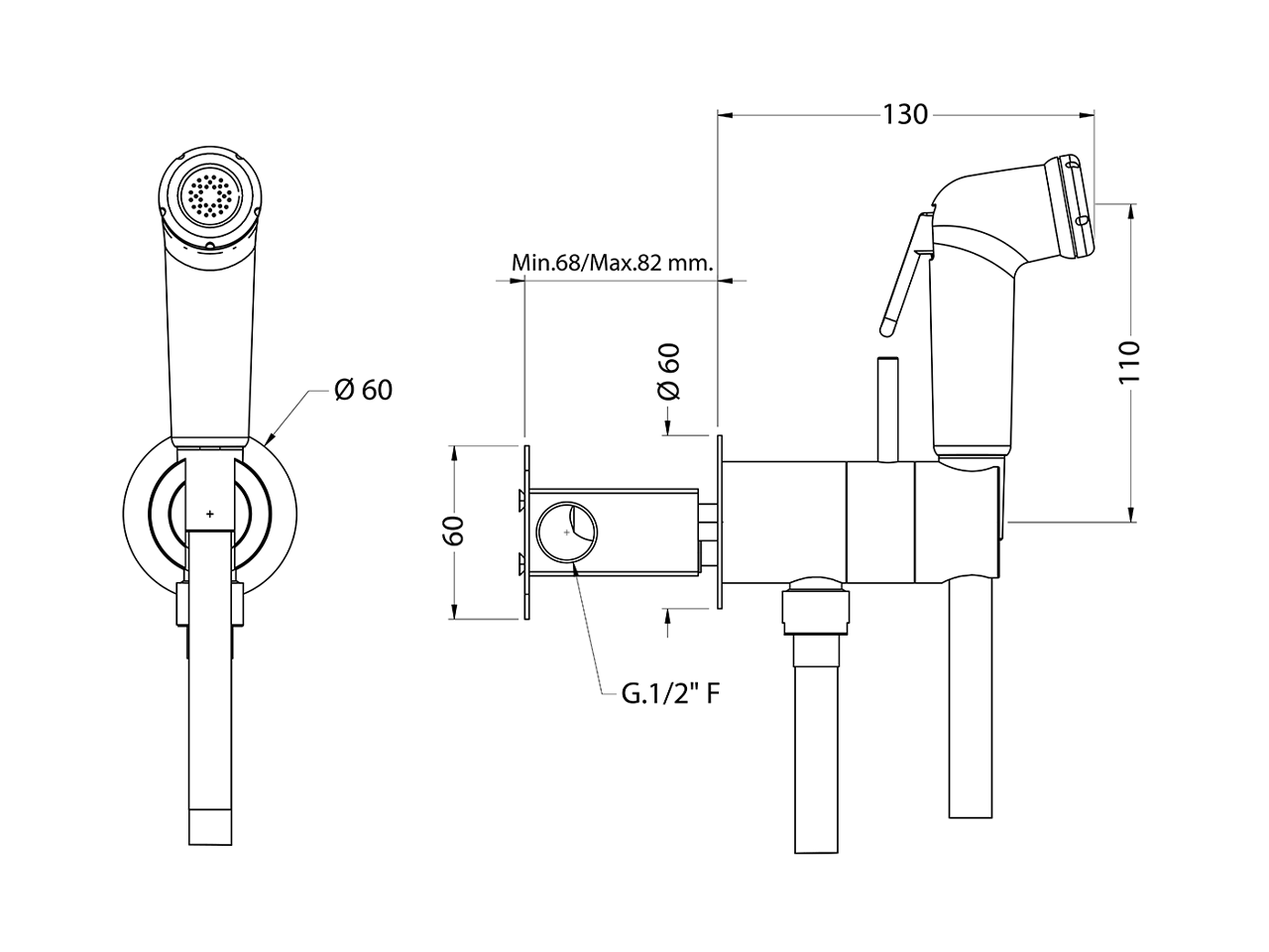 Set doccetta igienica completo,supporto murale tondo,miscelazione progressiva acque calda-fredda,completo di parte incasso,doccetta igienica in ABS - flex PVC 120 cm