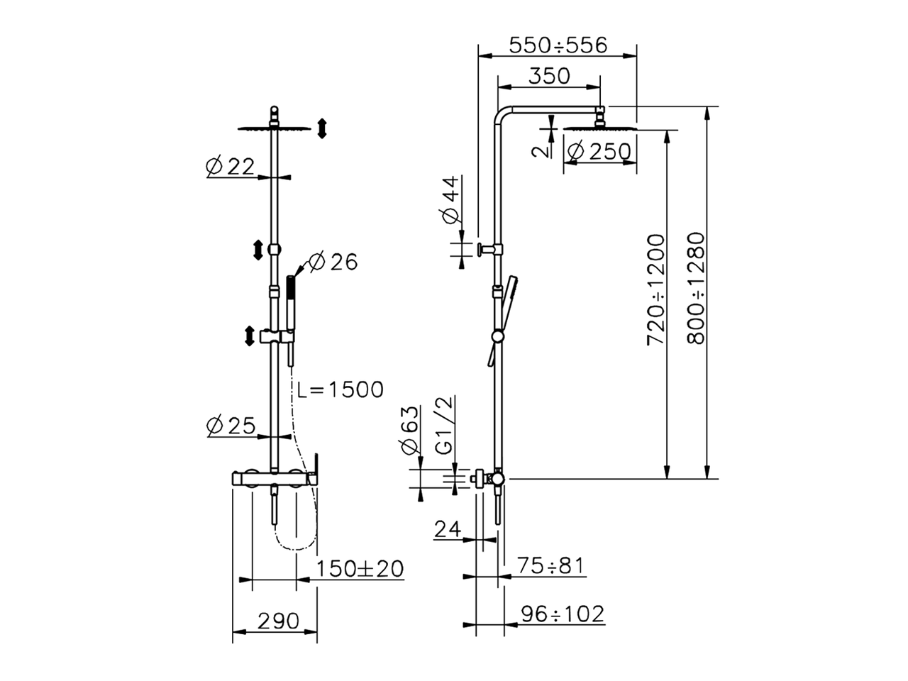 Colonna doccia monocomando 2 funzioni,deviastop 2 uscite,colonna telescopica,supporto doccetta scorrevole,doccetta monogetto minimalista in ABS D.26 mm,soffione tondo D.250 mm sp.2 mm in INOX,flessibile liscio SILVERFLEX 150 cm
