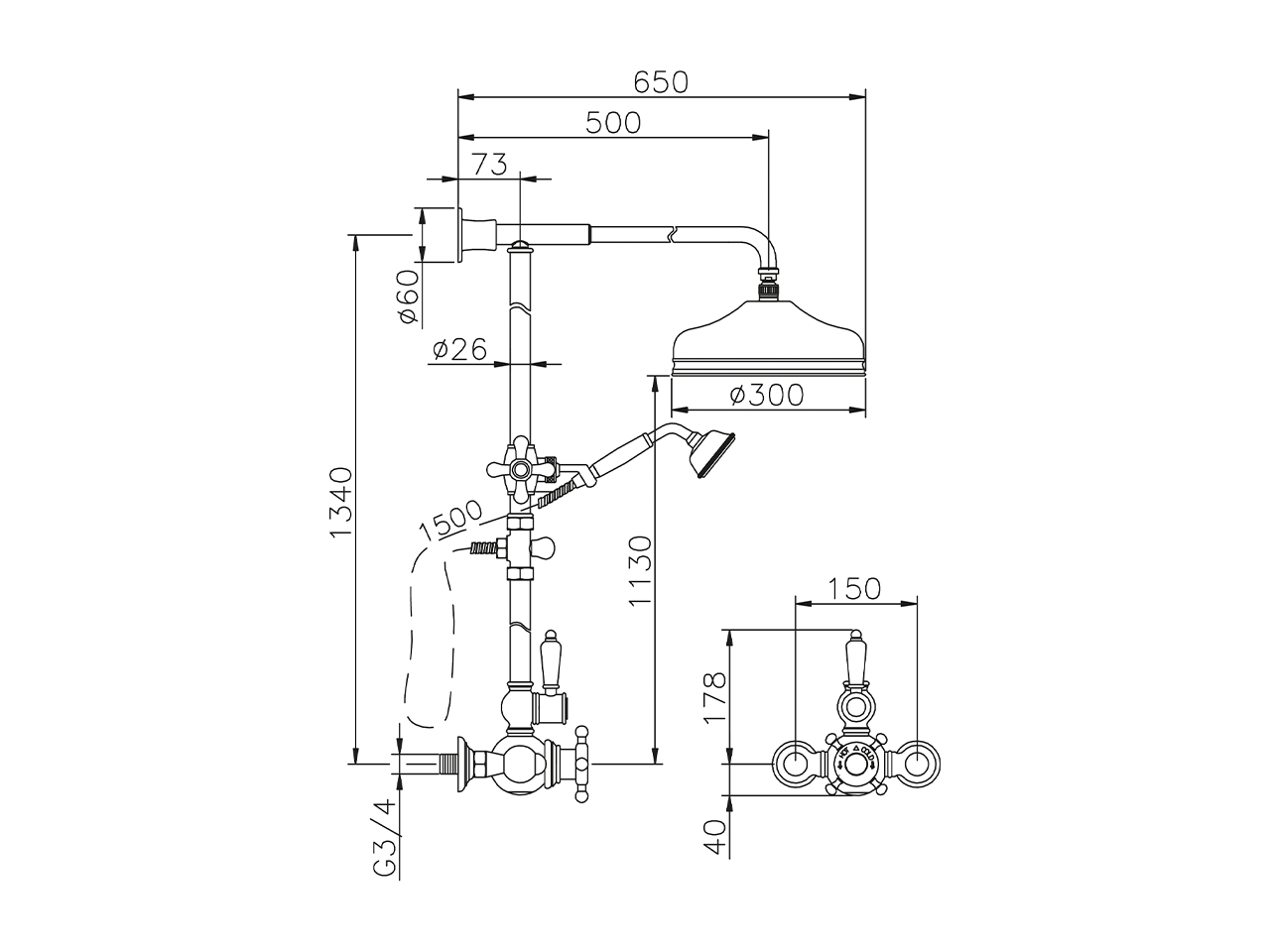 Colonna doccia termostatica 2 funzioni,deviatore 2 uscite,colonna fissa,supporto doccetta scorrevole,doccetta monogetto Classica D.78 mm in Ottone,soffione tondo D.300 mm in Ottone,flex Ottone 150 cm