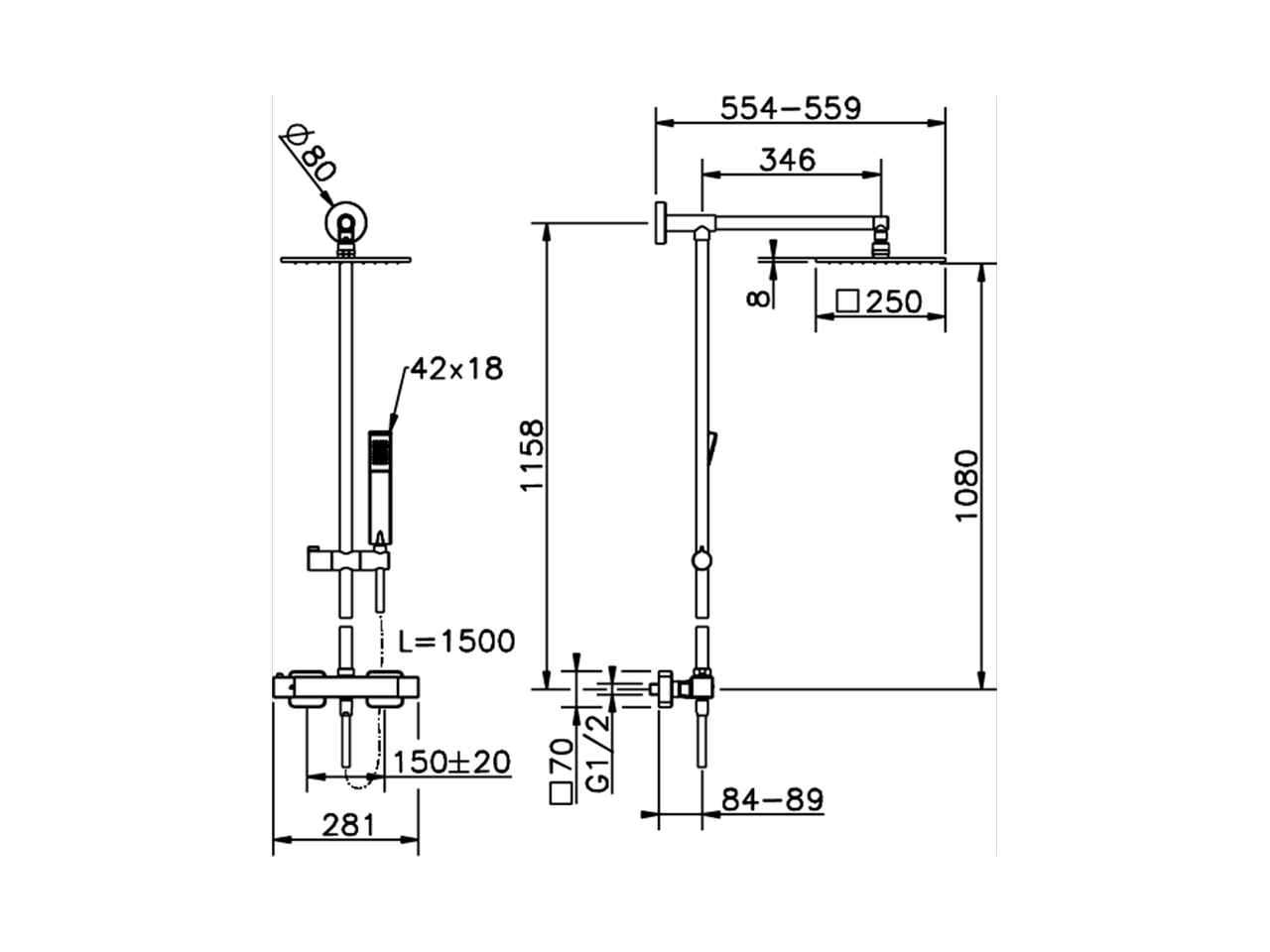 Colonna doccia termostatica 2 funzioni,deviastop 2 uscite,colonna fissa,supporto doccetta scorrevole,doccetta monogetto Quad 42x18 mm in ABS,soffione quadro 250x250 mm in OTTONE,flessibile liscio SILVERFLEX 150 cm