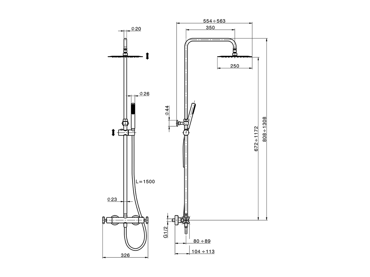 Colonna doccia termostatica 2 funzioni,deviastop 2 uscite,colonna telescopica,supporto doccetta scorrevole,doccetta monogetto minimalista in ABS D.26 mm,soffione tondo D.250 mm in INOX,flessibile liscio SUPREME 150 cm