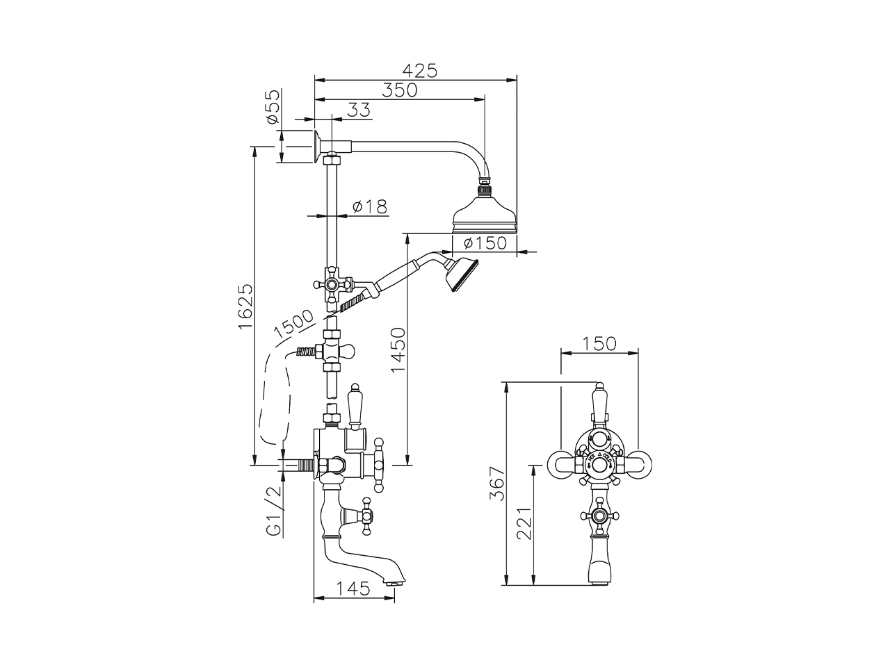 Colonna vasca termostatica 3 funzioni,deviatore 2 uscite,colonna fissa,2 rubinetti d'arresto,supporto doccetta scorrevole,doccetta monogetto Classica D.78 mm in ottone,soffione tondo D.150 mm in Ottone,flex Ottone 150 cm