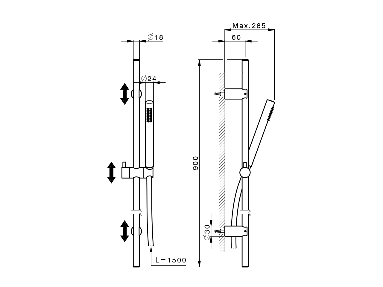 Completo doccia saliscendi Lynox,asta 90 cm con supporto scorrevole,doccetta monogetto minimalista D.22 mm in INOX,flex inox 150 cm,Inox AISI 316L