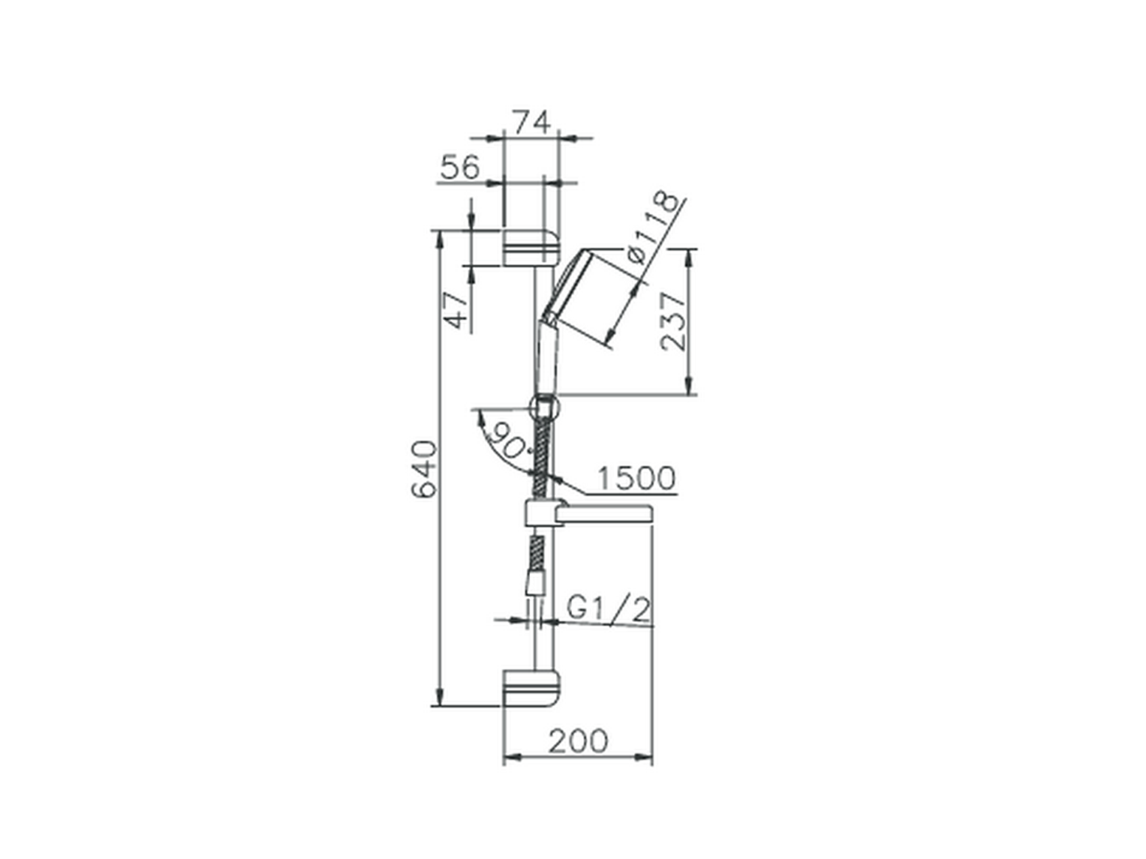 Completo doccia saliscendi,asta con supporto saliscendi 64 cm,doccetta monogetto D.118 mm in ABS,flex Ottone 150 cm