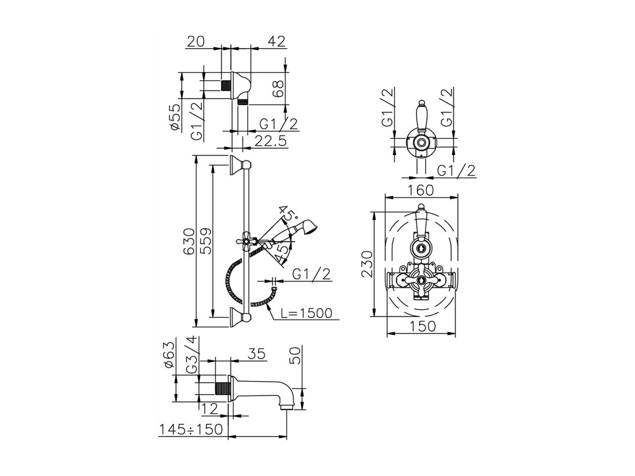 Completo miscelatore termostatico vasca incasso,miscelatore termostatico incasso 1/2",rubinetto d'arresto con uscita 1/2",deviatore 2 uscite,asta 56 cm con supporto scorrevole,doccetta monogetto Classica in Ottone D.53 mm,bocca erogatoria 150 mm 3/4 M,presa d'acqua 1/2",flex Ottone 150 cm