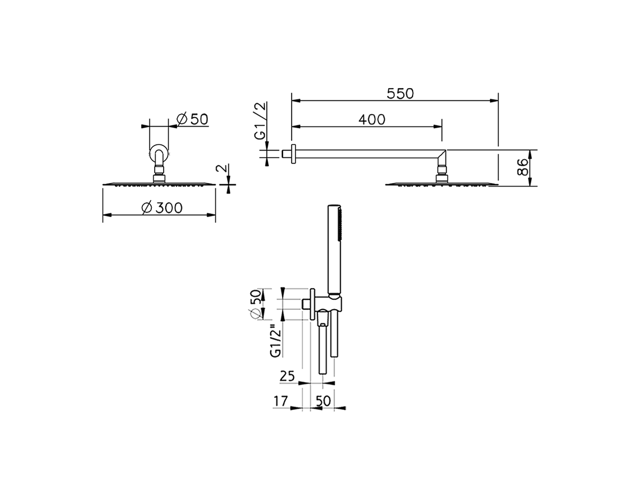 Kit braccio doccia con presa d'acqua,braccio doccia L.400 mm,soffione tondo D.300 mm SP.2mm in INOX,doccetta monogetto minimalista in ABS D.26 mm,presa d'acqua 1/2",flessibile liscio SILVERFLEX 150 cm
