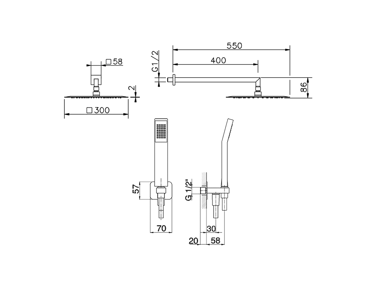 Kit braccio doccia con presa d'acqua,braccio doccia L.400 mm,soffione quadro 300x300 mm sp.2 mm in INOX,doccetta monogetto Quad 42x18 mm in ABS,presa d'acqua 1/2",flessibile liscio SILVERFLEX 150 cm
