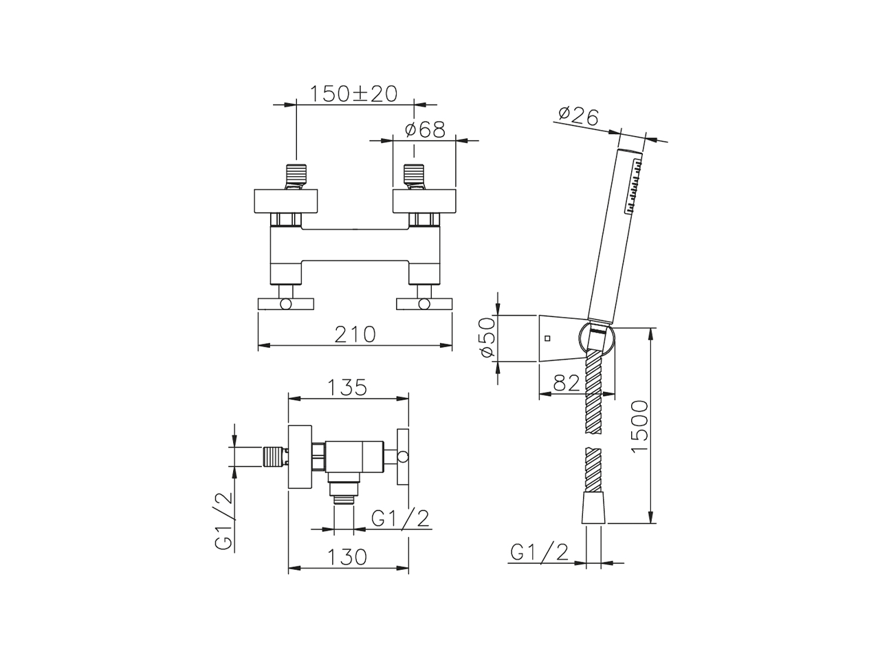 Miscelatore doccia completo,supporto doccetta snodato murale,doccetta monogetto minimalista D.27 mm ABS,flex Ottone 150 cm