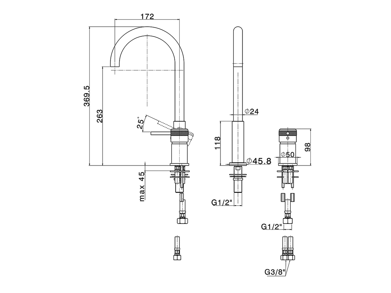 Miscelatore monocomando lavabo 2 fori,senza scarico automatico,bocca girevole,flex inox G.3/8"