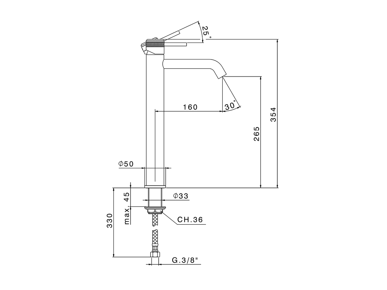 Miscelatore monocomando lavabo alto,senza scarico automatico,flex inox G.3/8"