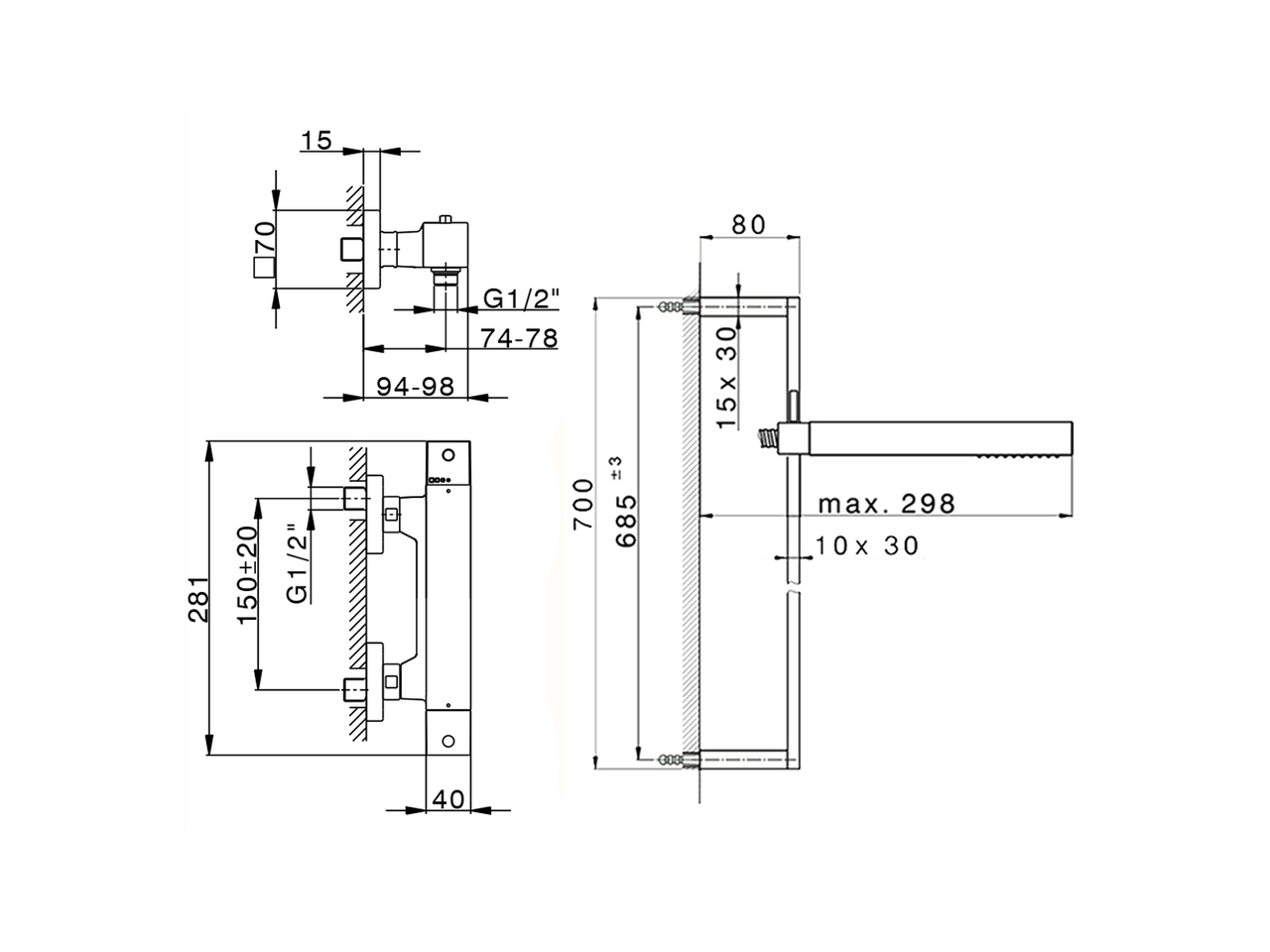 Miscelatore termostatico doccia con saliscendi,asta 70 cm con supporto scorrevole,doccetta monogetto minimalista quadra 27x27 mm ABS,flessibile liscio SILVERFLEX 150 cm