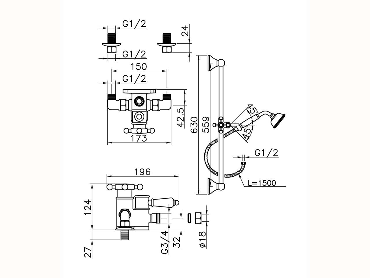 Miscelatore termostatico doccia con saliscendi,saliscendi con supporto scorrevole 56 cm,doccetta monogetto Classica in Ottone D.78 mm,flex Ottone 150 cm